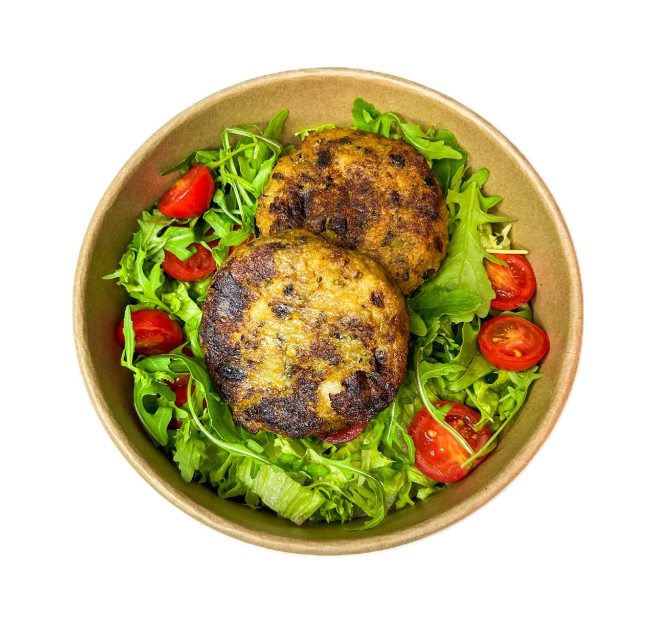 Burger di patate, cereali, zucchine, melanzane, insalata gentile, rucola, pomodorini.