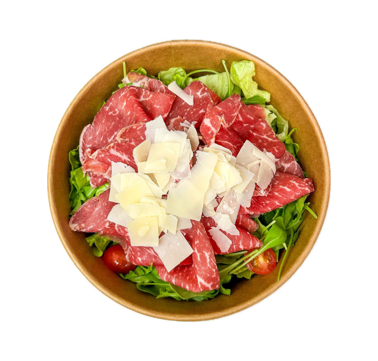 Angus affumicato, insalata gentile, rucola, pomodorini, scaglie di grana
