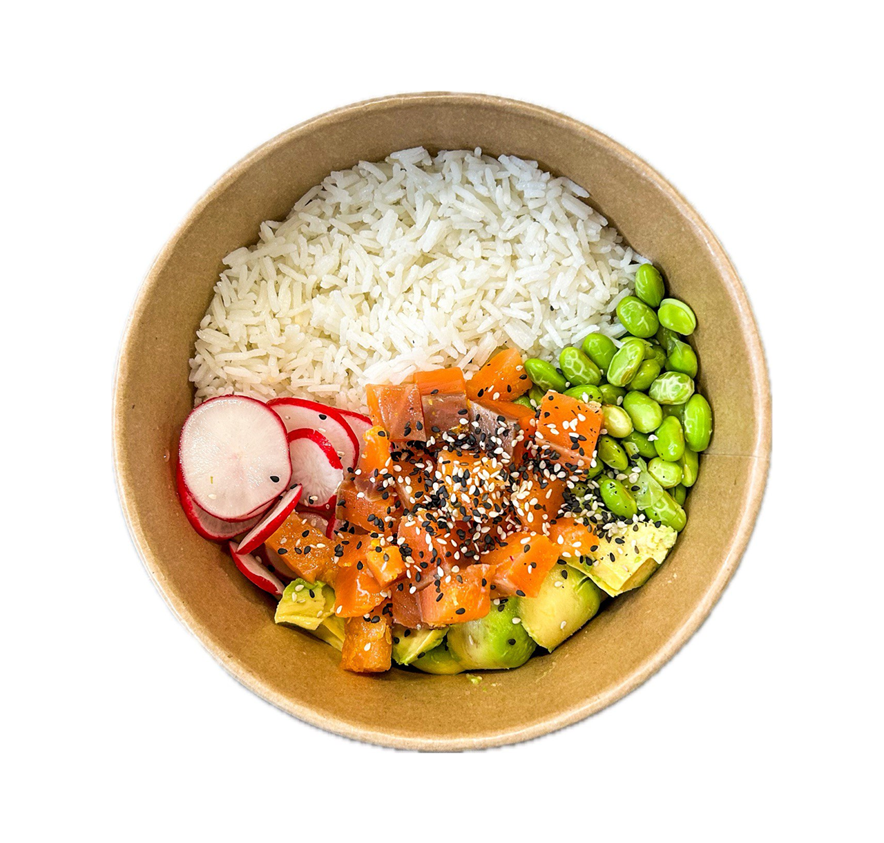 Riso basmati, salmone marinato, fagioli edamame, avocado, ravanelli, semi di sesamo.