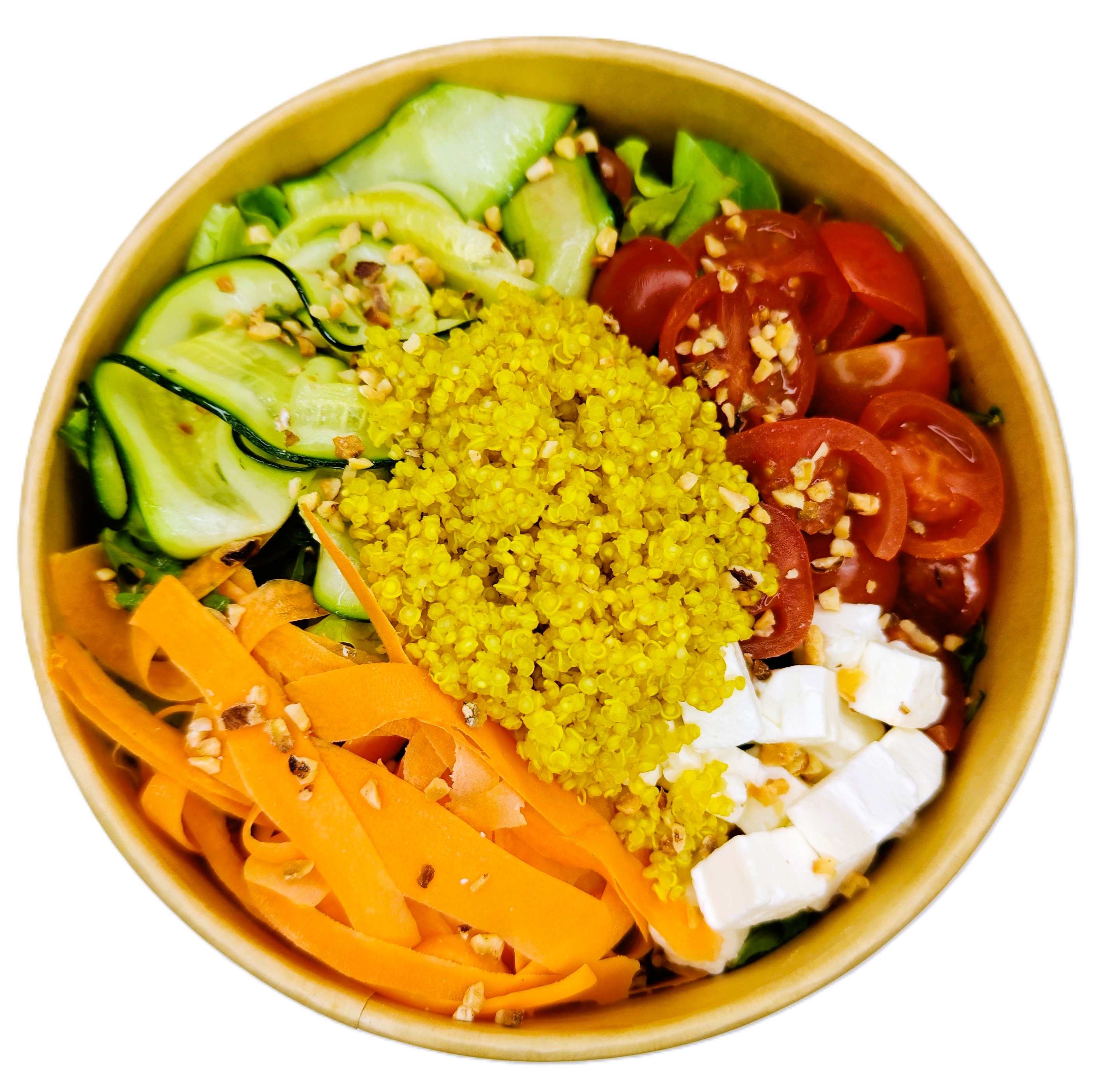 Insalata, Rucola, Pomodorini, Carote, Feta, Zucchine marinati, Quinoa, Granella di Nocciole, Philadelphia.