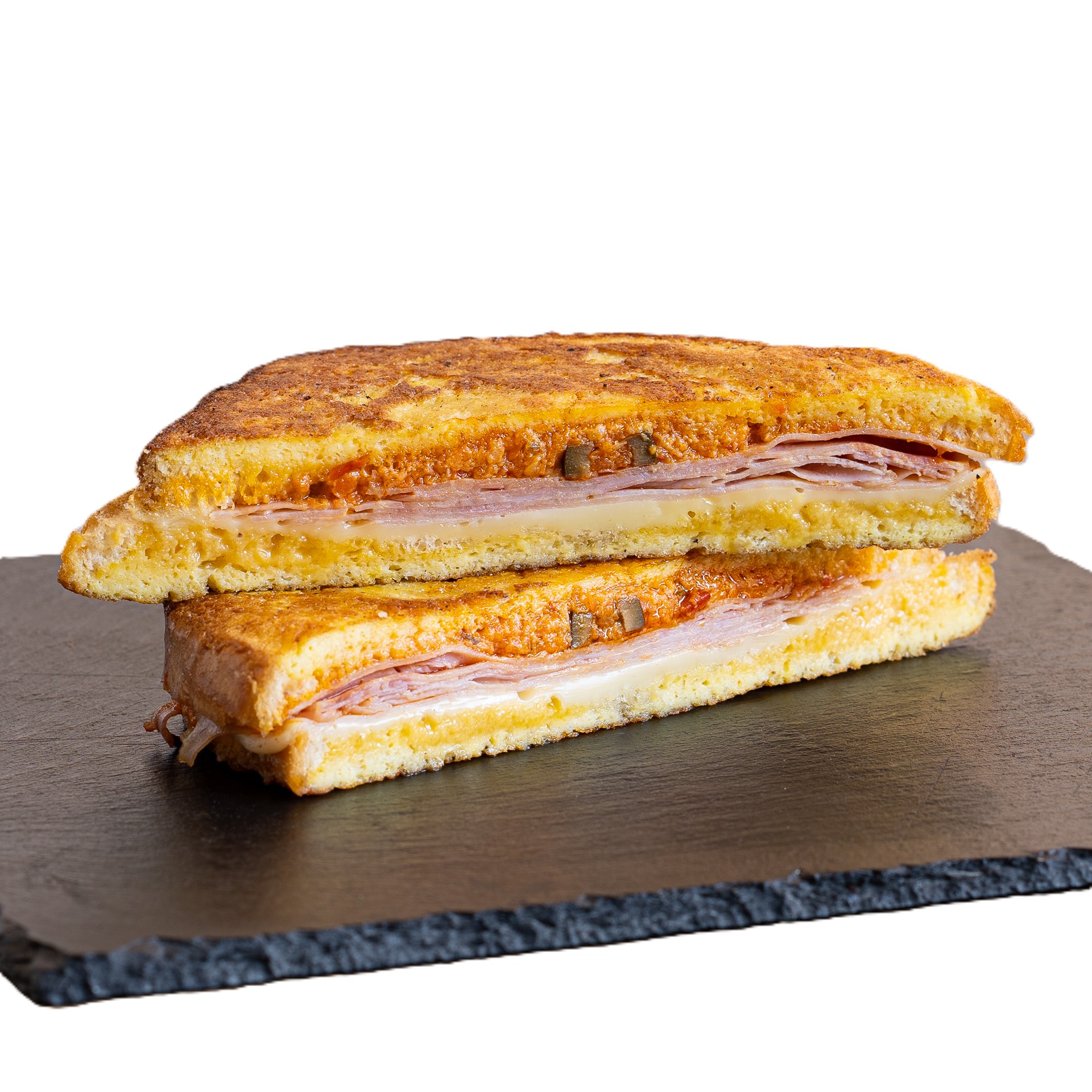 Carrè americano, prosciutto cotto, battuta di verdure, edamer e uovo. Accompagnato con salse.