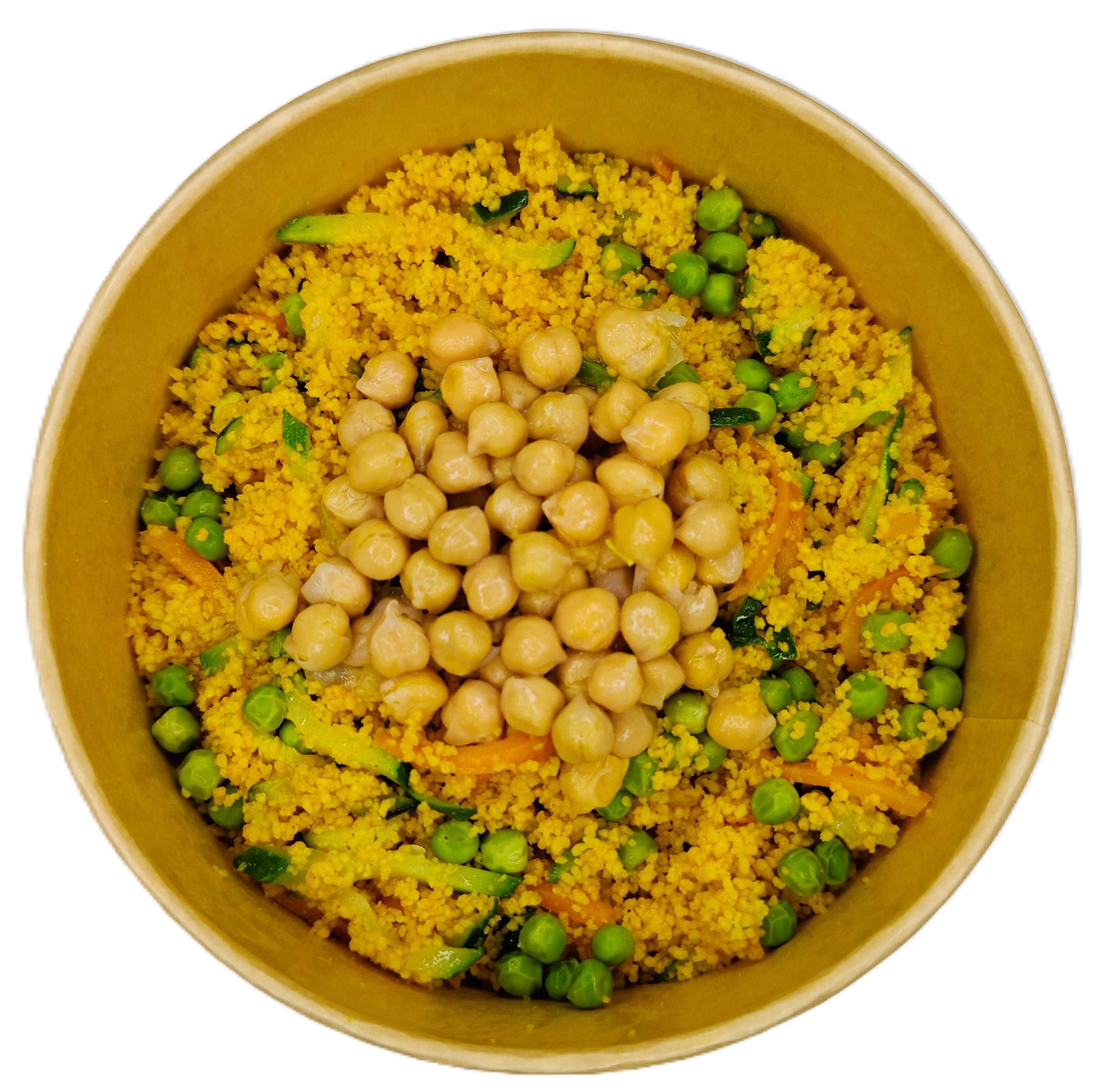 Cous cous, zucchine, peperoni, carote, piselli, ceci.