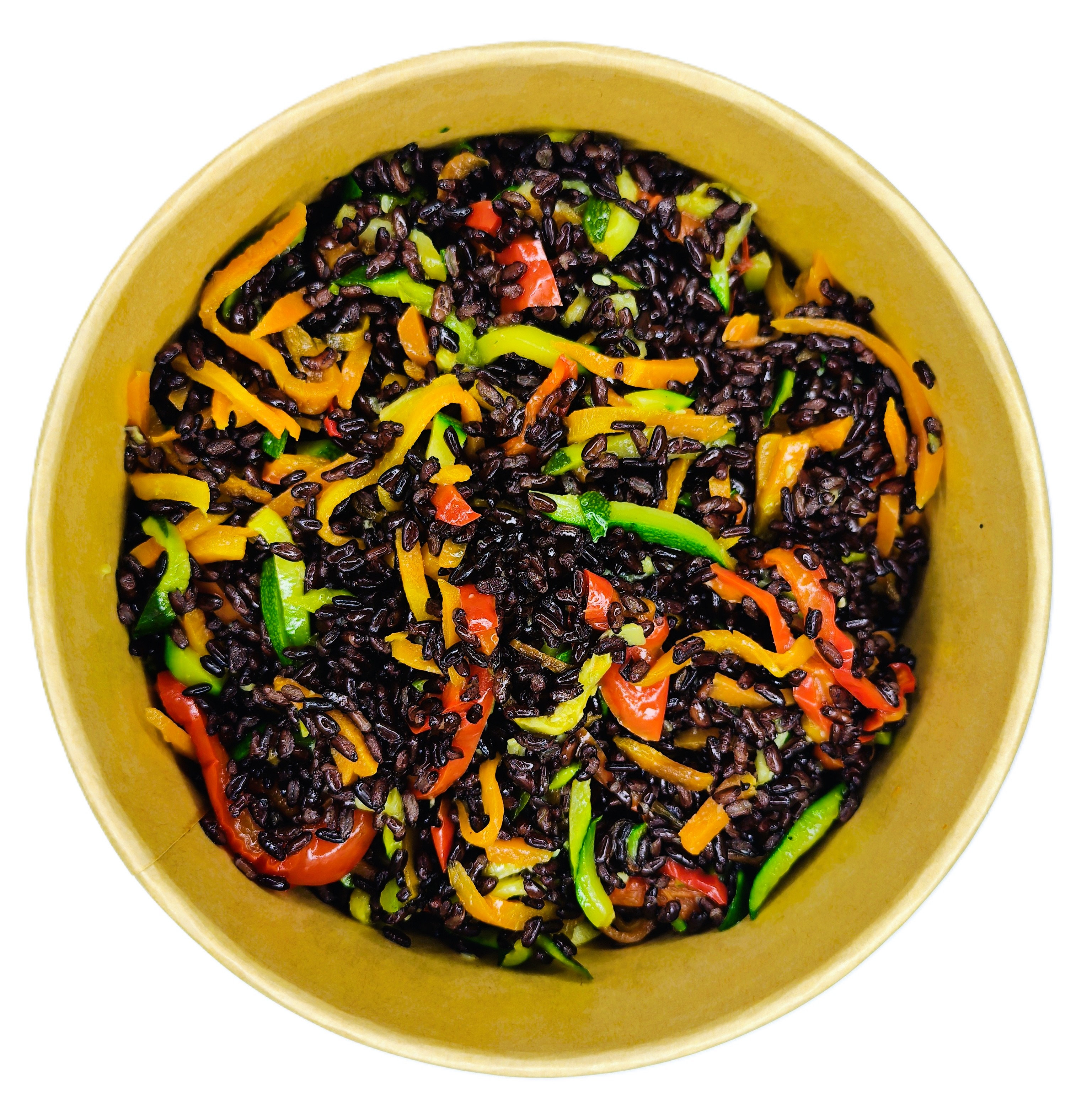 Riso Venere, porro, zucchine, carote, peperoni, piselli.
