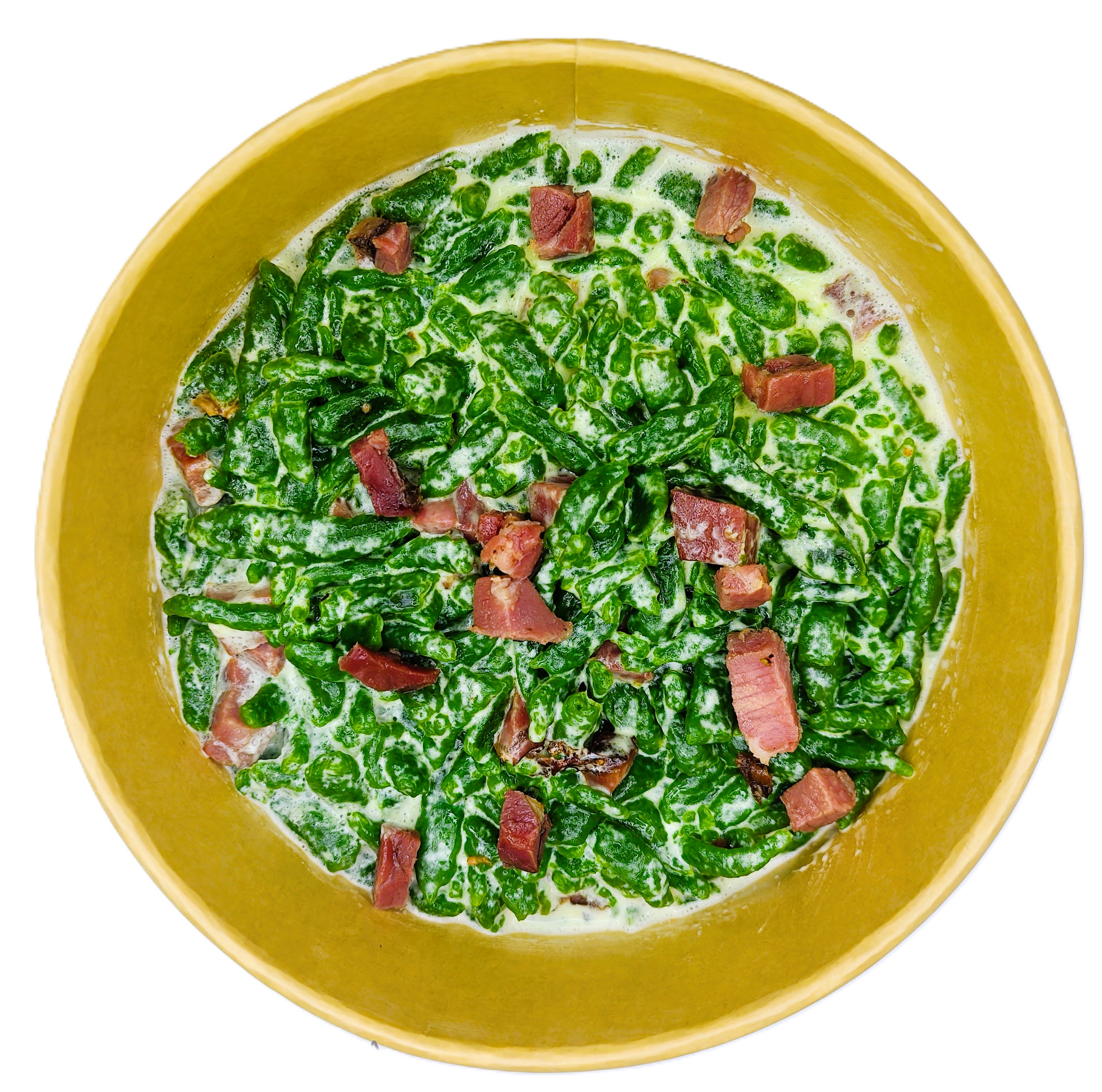 Spätzle di spinaci, panna, speck, parmigiano reggiano.